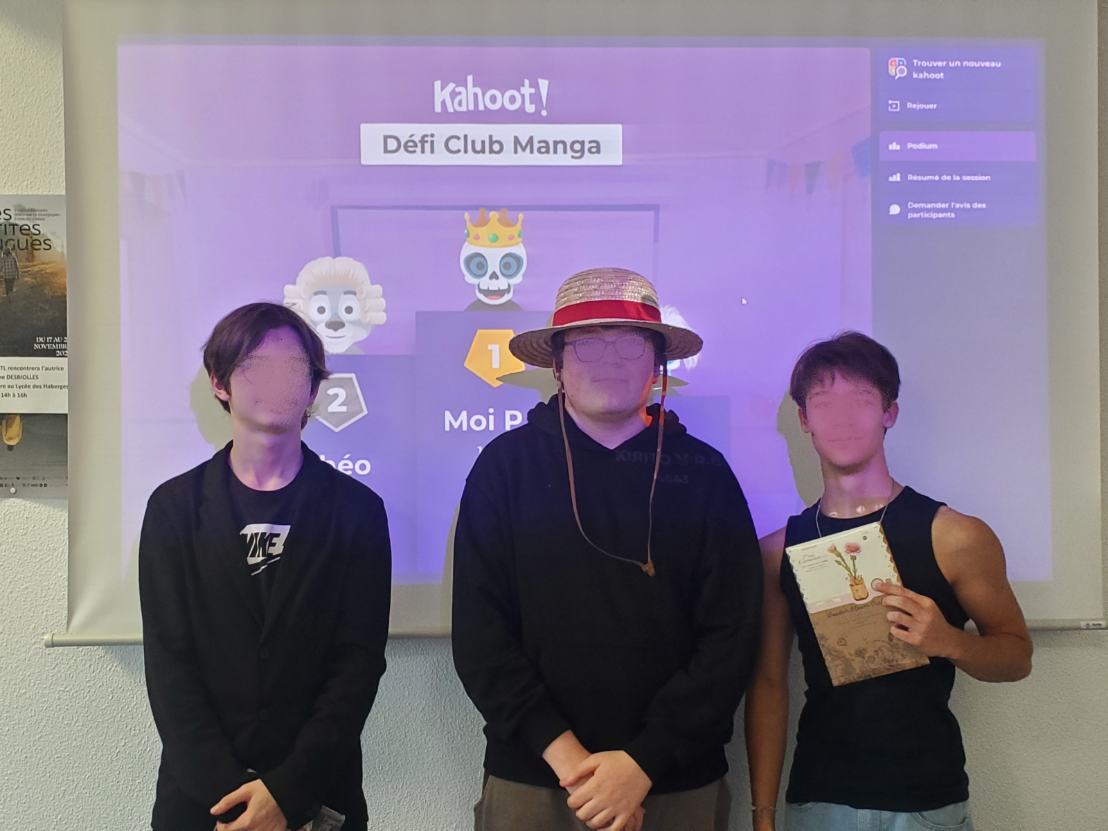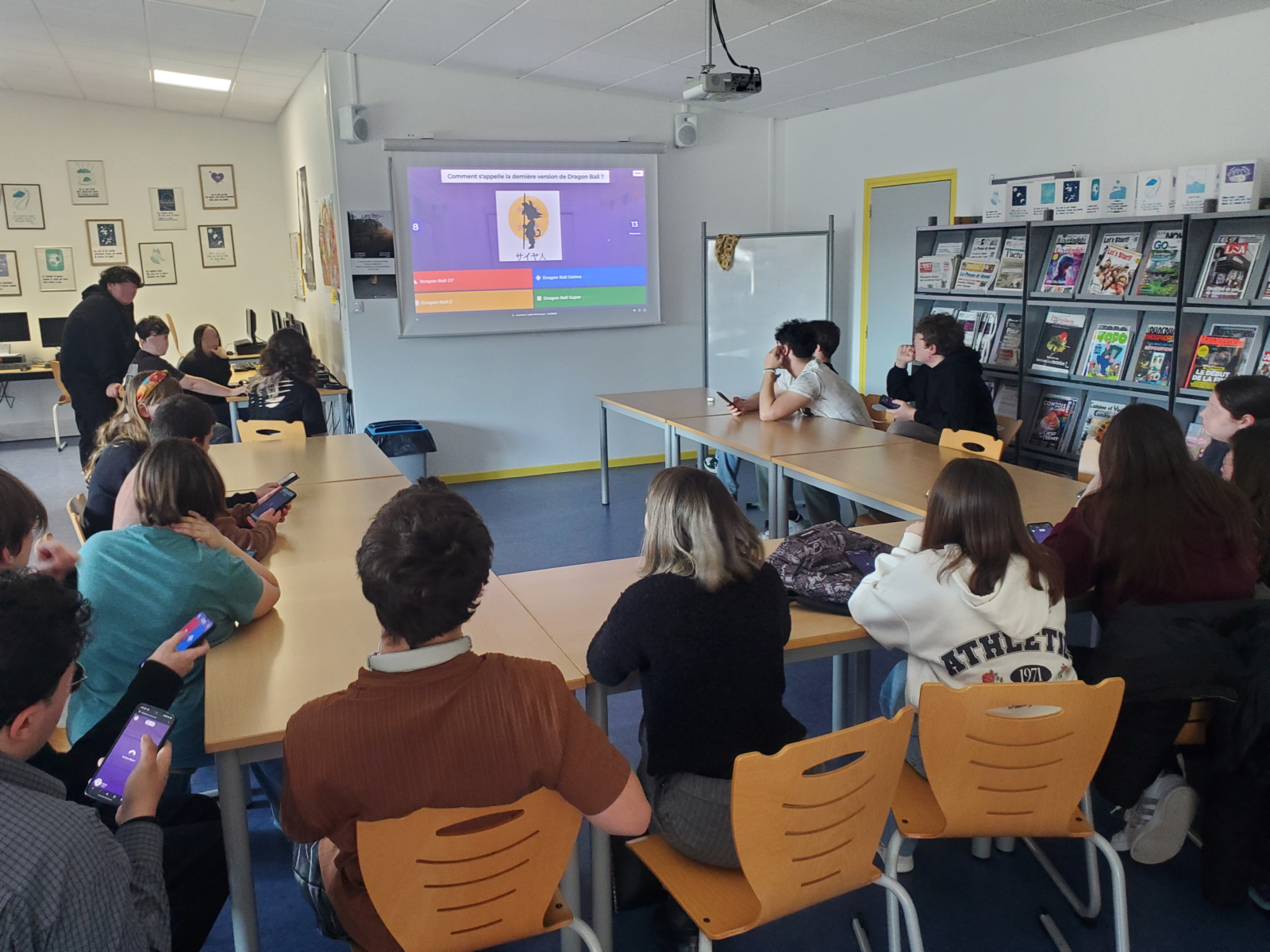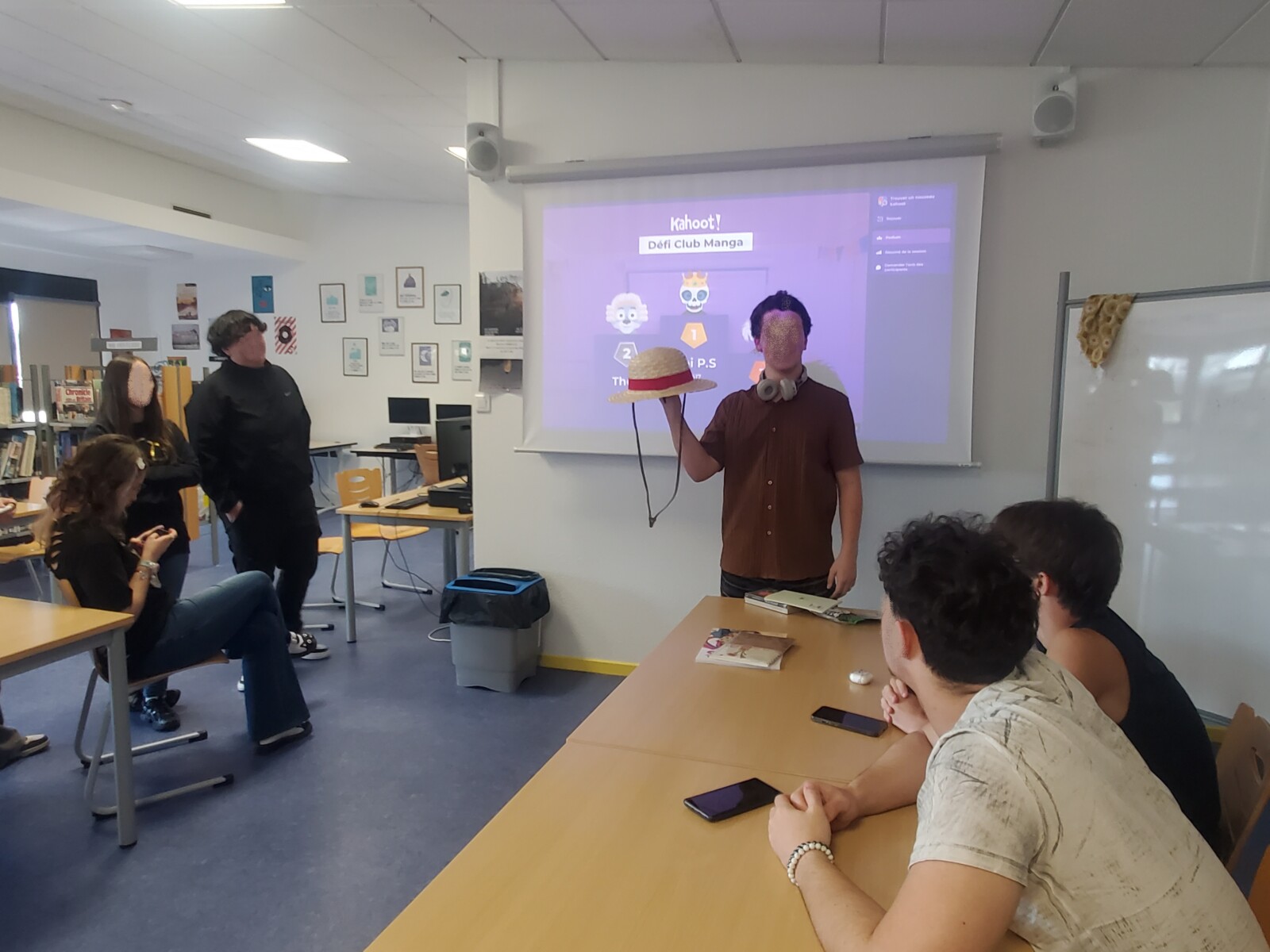 Avant ce temps fort, les élèves du club Manga avaient organisé l’activité avec enthousiasme et énergie : affiche réalisée à la main par le coup de crayon talentueux de Mélina, élaboration des questions sur un large spectre de mangas, communication sur la manifestation, choix des lots et production du Kahoot !